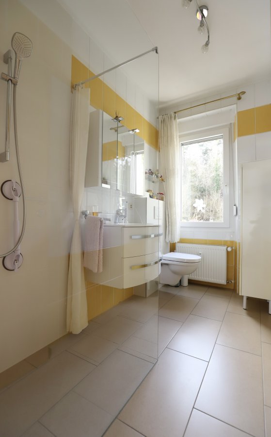 - Salle de douche avec douche à l'italienne, WC, lavabo et fenêtre